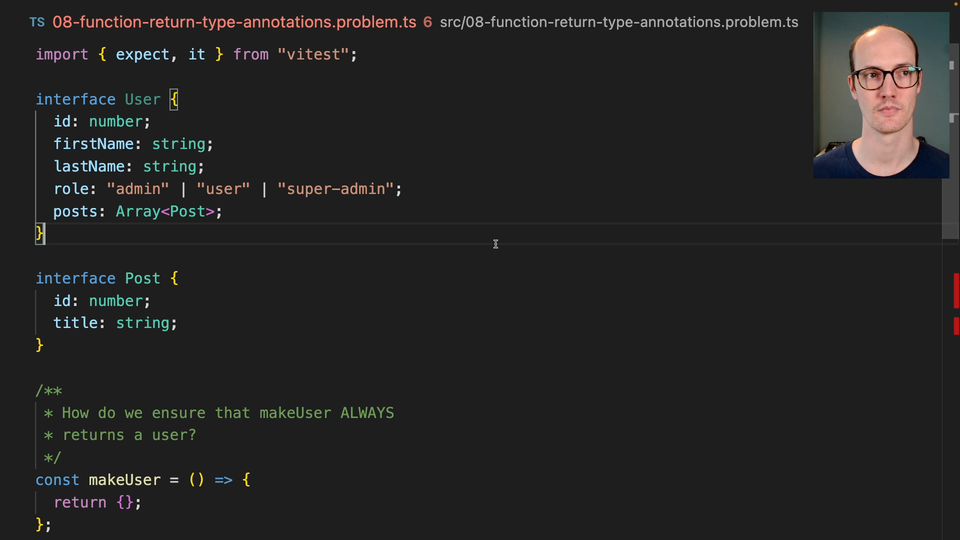 0:43 In this case, it's going to be pretty nice to ensure that makeUser always returns a user, very similar to the problem we had before, where we wanted to make sure that the error message was on the correct line.