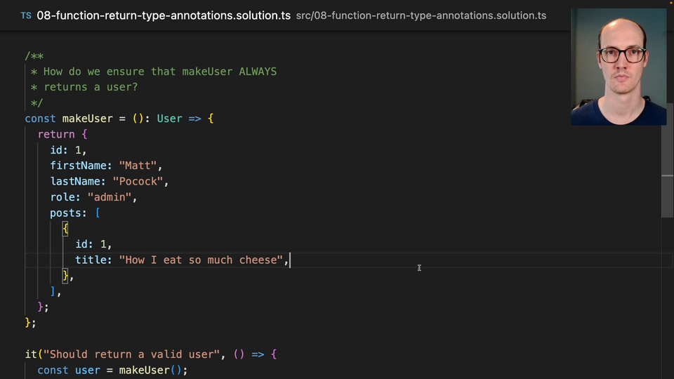 0:17 Now even if I get this wrong inside here, then actually this stuff is still going to be OK. Because I've said that make user always returns a user. anytime that you actually create a user, TypeScript is going to say, "OK. Yeah. I understand that. You've created a user." but it's going to yell at you closer to the call site.