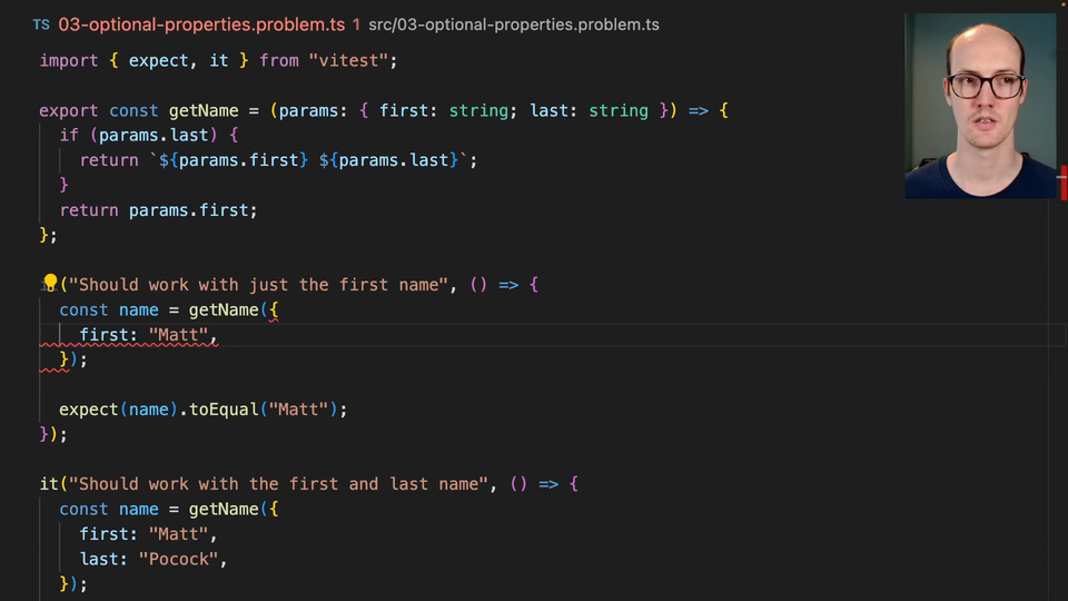 0:24 It's telling me I do need to parse the last name here. I don't want to. Figure out a way that you can type this object where last is optional.