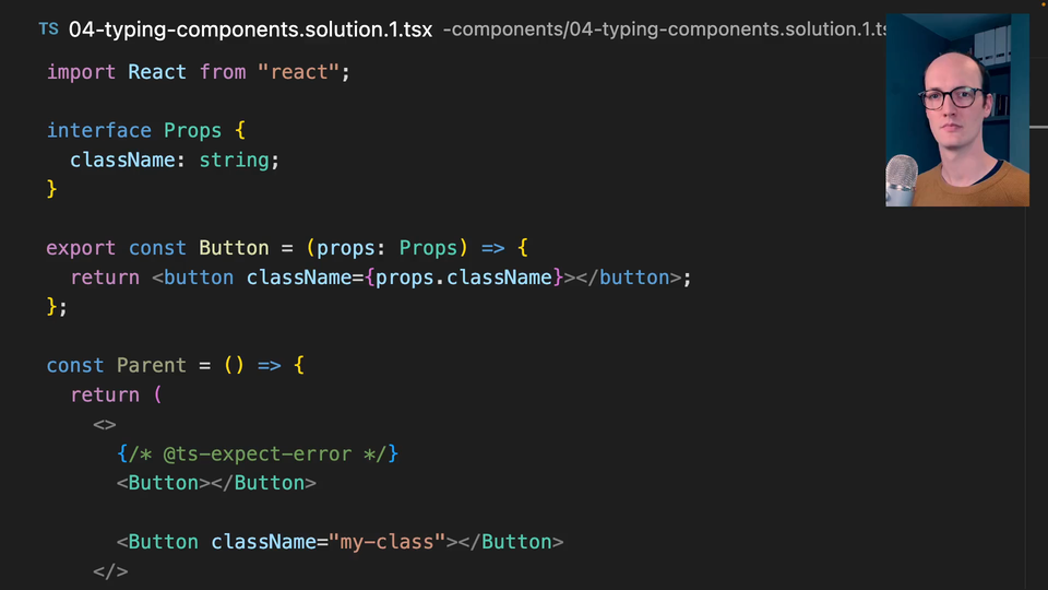 0:00 There are four main ways to achieve this. When we have an interface here, we're saying, "OK, these Props correspond to this interface," which means that we have className: string here.