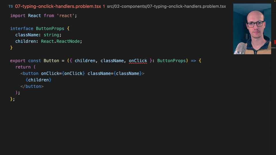 0:13 Your challenge is to try to work out what we can type this as and how we can add onClick to the props here in a way that makes sense and will match the type that button expects. Good luck.