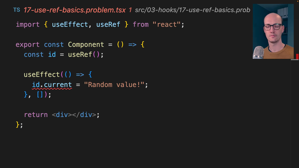 0:00 Let's take a look at useRef here. We have a component that inside it has an ID. In a useEffect, we're assigning that ID to a random value. The way that this works is we have id, which is a MutableRefObject, and id.current is basically the API, so id.current, current is the only property on this id-ref.