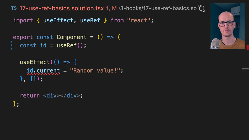 0:39 Yes, we can pass a string to it. Now the id is going to be typed as React.MutableRefObject string or undefined, and id.current is now string or undefined.