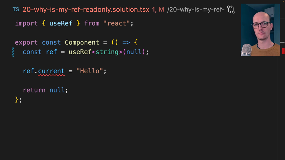 1:52 Why am I pointing this out? If we look at the firstOverload and what it returns, then you'll see that we get a MutableRefObject. Let's just command-click there, take a look at this type MutableRefObject. This is just current T. You notice that it doesn't have readonly in front of it. In other words, this can be mutated.