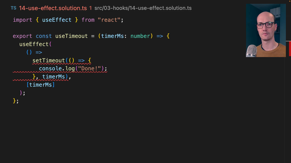 1:57 What we can do, we can say, "const timeout = setTimeout." Then, inside the EffectCallback, we can return clearTimeout timeout. This is just a way to introduce you to the basics of useEffect's API and also show what it will accept and what it won't accept.