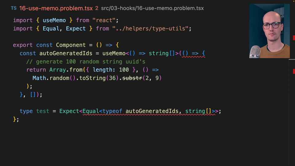 0:28 The thing that we're getting back is not this array of strings here. We're getting back a function that returns an array of strings. Your job is to figure out what has gone wrong here and dive into the type signature of useMemo to figure out what the real API is type-wise.