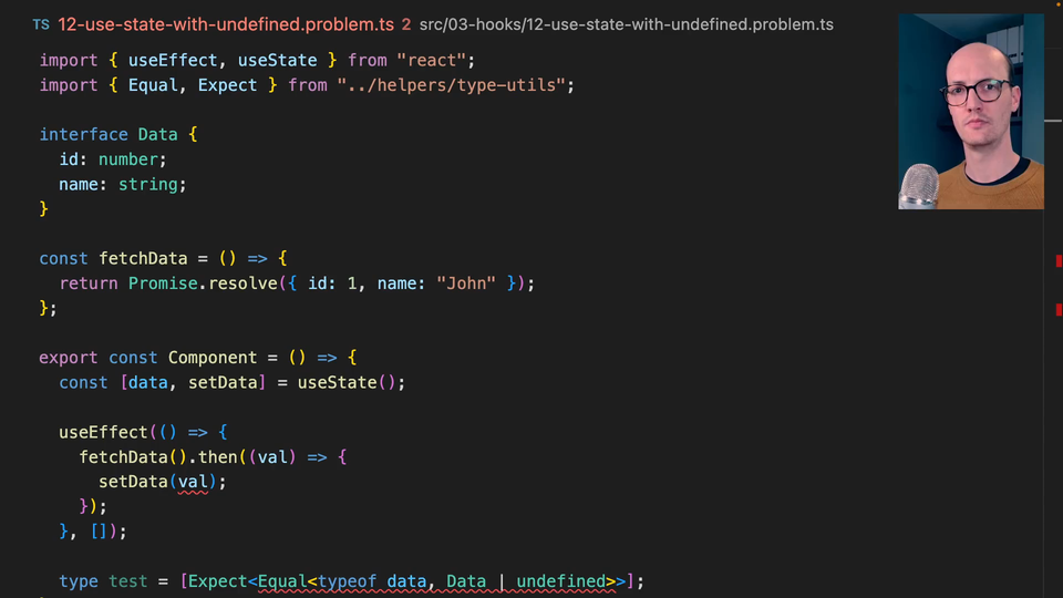 0:42 Your job here is to try to figure out how to make that into Data or undefined, because we can't pass in an initial value here to let TypeScript infer. What's happening is we're just getting undefined being inferred in this slot. Your job is to work out how to make this work and the best way to do it. Good luck.