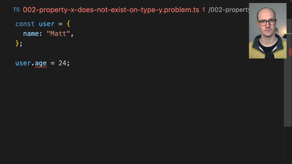 00:37 is user dot name here. And so we can either do it with a dot syntax or with user name here. So how do we tell this object up here that it might contain an age property? That's interesting. Well, that is solution one because what TypeScript is doing here is it's saying,