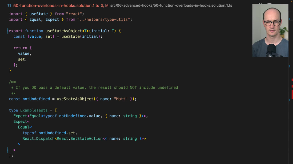 00:47 But in fact, no, whenever we pass an argument to this, it's going to actually just hit the first overload, meaning that undefined is never assignable to it. So what this means then is we need to copy useState's overloads in any function that wraps it.