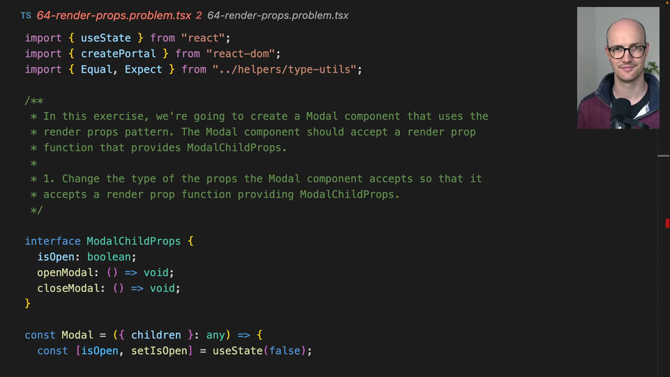 01:17 is we're expecting the props to be equal to modal child props, which are defined up here. And your job is to work out a way that we can type children strongly so that it actually works for us, and we get this API. This isn't necessarily everything render props can be, but passing them as children is kind of quite idiomatic.