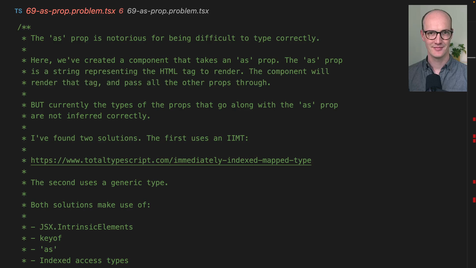 00:00 In this exercise and the next few exercises, we're going to be looking at the ASPROP. The ASPROP is probably the most complex TypeScript situation you can find yourself in in React. And so I want to prepare you, give you lots of different ways that you can tackle it, and also lots of different sort of difficulty levels as well.