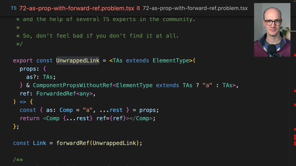 00:17 So we have a ref which is a forwarded ref, any, here, and we're now wrapping it with forward ref and we end up with a link component. Now, this one is way too hard for you to find. Way too hard. It involves forward ref, like the fixed version of forward ref that we've