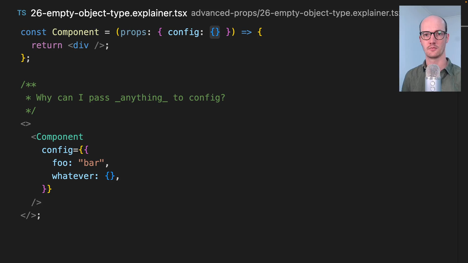 00:00 Let's take a look at this component here. This component takes in a single prop, which is described as config. And config takes in this kind of empty object type here. But this is a very strange type because it lets me pass absolutely anything I want