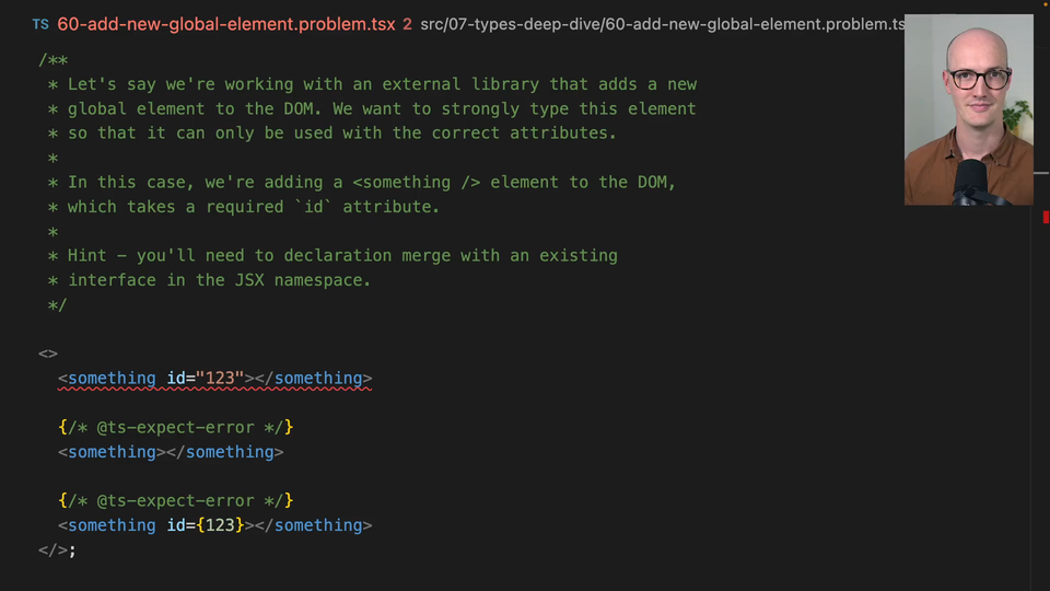 00:17 We're going to need to declaration merge with something in the global namespace that we've seen before. I think you're getting the idea here. In fact, the error that we're getting here is property something does not exist on type JSX.IntrinsicElements. In this case, we're not wrong, it's the types that are wrong.