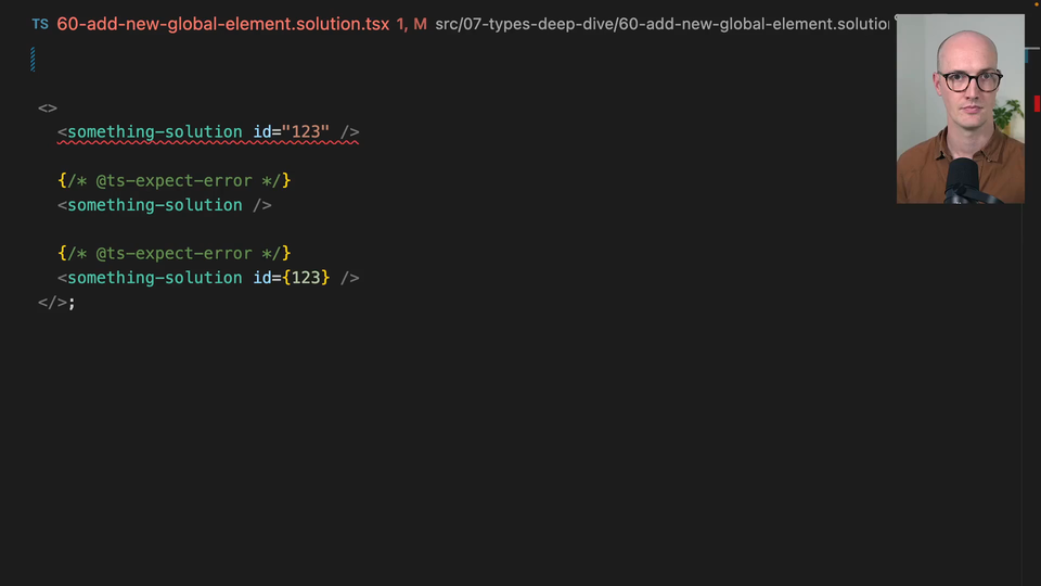 00:00 So the thing we know from this error is that JSX.IntrinsicElements is the thing we want to target with our declaration merge. We want to pull this into the global scope here, so we'll declare global. To declare global, we're going to basically say,
