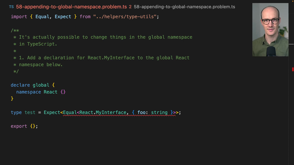 00:00 It's actually possible to change things in the global namespace in TypeScript. Here we have a declare global, which is where some namespace react lives. And what we want to do here is we just want to add in a my interface interface. And that's just going to sit there and it's going to have foo string on it.