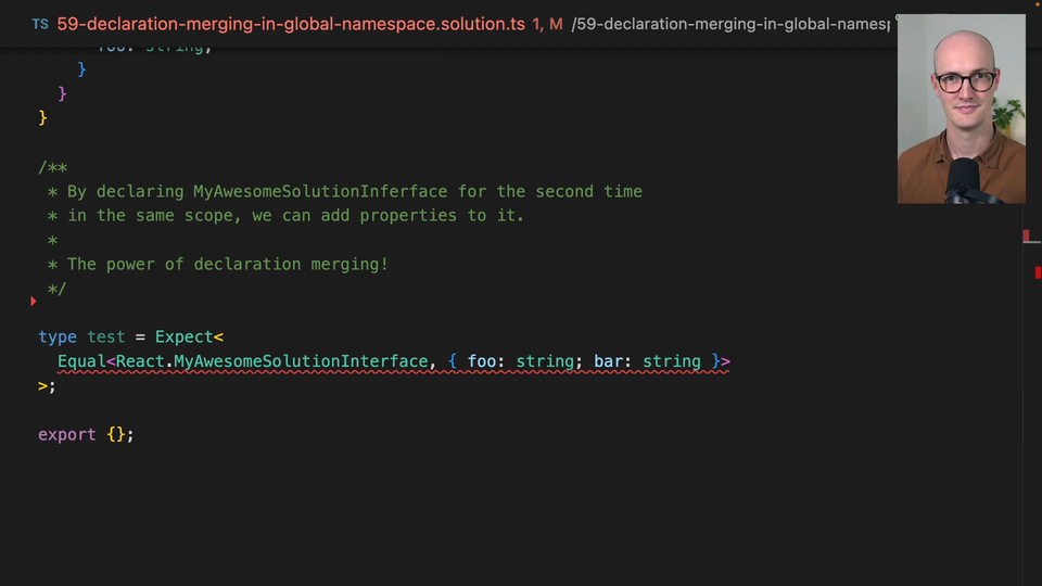 00:00 So the solution here is basically to copy this over to add a new declareGlobal because you can have multiple per file. And now, instead of having foo string, we can actually just add bar string. And those interfaces, because they're in the same scope, they get merged. So this is declaration merging of interfaces.