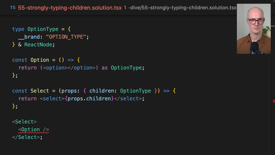 To recap the problem, we are using this branded type to make sure that only Option elements can be passed as children to the Select component: