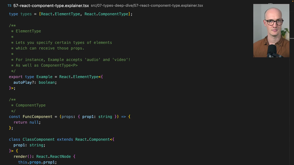 00:00 Let's take a look at two more type helpers that crop up again and again and again when you're using React. We have element type and component type here. Now element type is really weird because what it does is it basically accepts kind of some props here. And it kind of derives what types of components