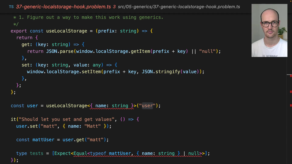 01:15 So what your job is, is to try to find a way to make useLocalStorage a generic function, to turn it into something that takes in a type argument that we can manually pass in here. That's your job. So you will need to basically find some way to do that,
