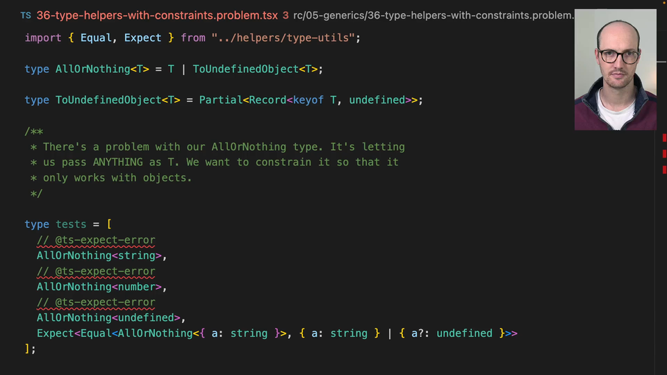 00:00 So we've introduced this new type helper into the code base. Everyone's happy, but there is a problem, which is we have like all or nothing can receive anything, like not just objects, like it can receive strings, numbers, undefined, null. Anything can be passed into this T here, which seems really, really strange.