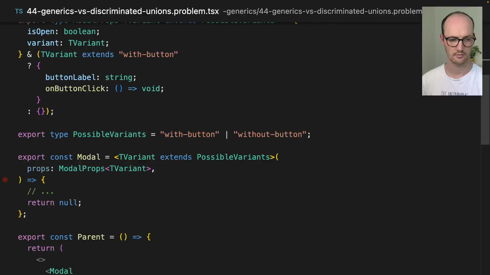 00:00 In this exercise, we're going to take a look at an example where generics are actually not as helpful as a different way of doing things. So here we have a type of modal props. Modal props takes in a type or type argument of T variant and T variant extends possible variants.