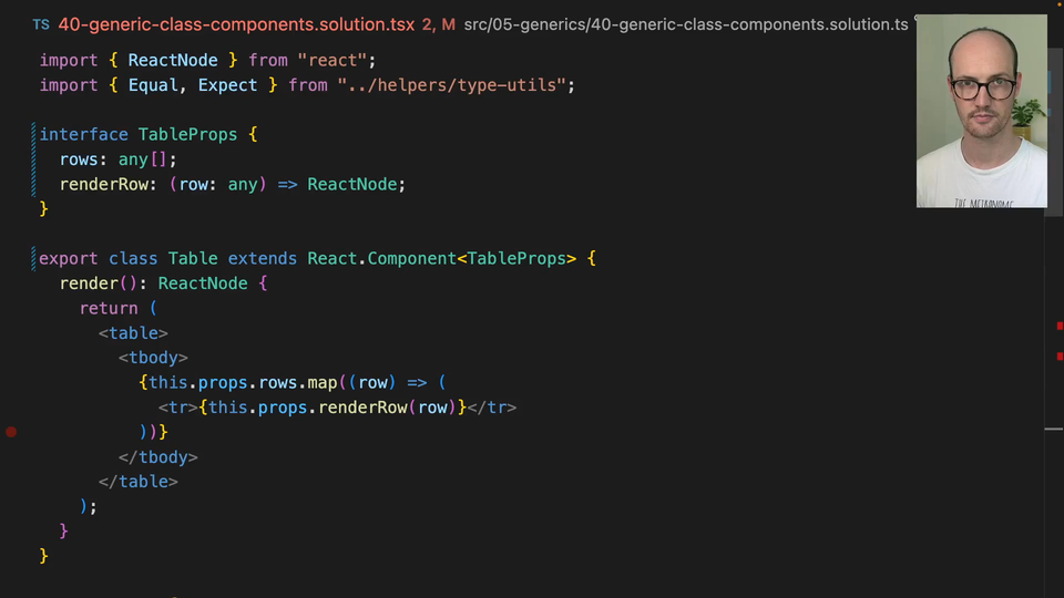 00:18 but we cannot find name T row. So where on this line do we instantiate T row? Well, the key is to put it just next to this table here. So table T row extends React component TableProps T row. This again works just beautifully.
