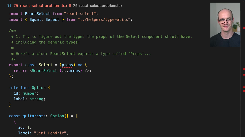 00:00 In this exercise, we're going to look at a classic integration problem between React and TypeScript, which is React Select. React Select is a really popular library for building select components. And I've noticed actually in a couple of production code bases I've looked at, they use this and they have a real problem wrapping it and creating their own abstraction from it.