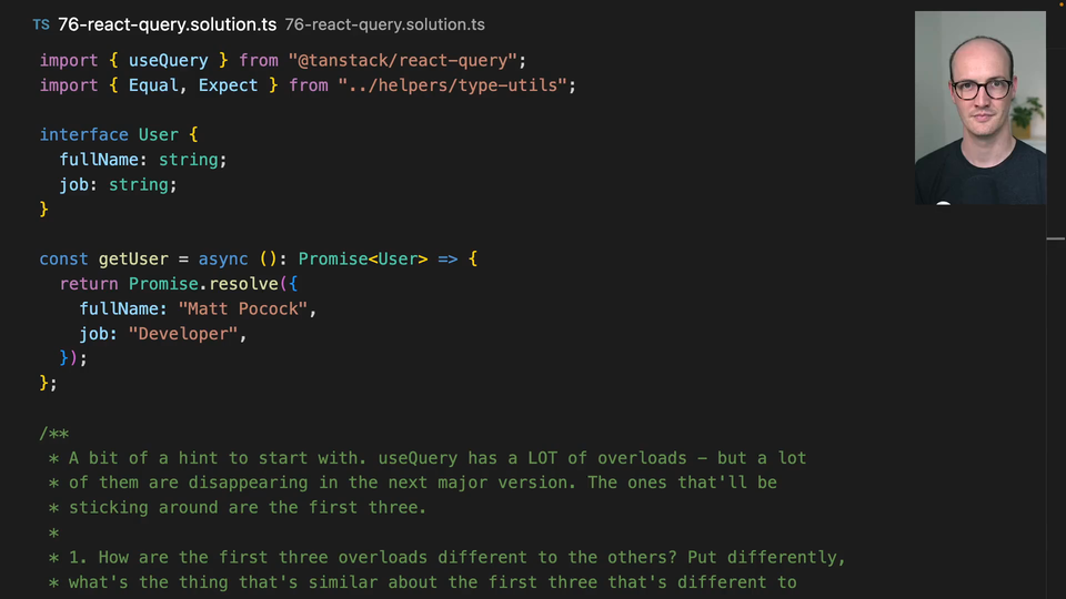 00:00 Okay, let's dive in, see what these overloads are up to. So we can come on click here to see them. And we've got many, many, many of them. Good old nine overloads here. So I'm going to word wrap just to see everything. Now, we start here with a useQuery function. And we can see that all of these overloads, it seems to me, have a very, very similar type arguments on them.