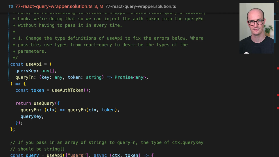 00:00 Okay, let's give this a go. Now, the question here is how many type arguments do we want to use here? This isn't exactly the same as React Select where we wanted to exactly copy the API. It's got a very, very small API, really, and we just need to make sure that useQuery, the data here, is being inferred correctly.