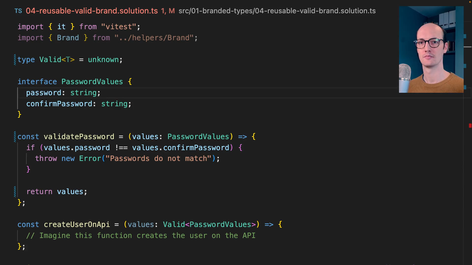 0:20 We probably don't need to make this T brand generic. We can just use a single brand which is going to be valid. Then we pass that T in. We should be able to call it with brand T, and then valid here. It doesn't really matter what this is as long as there's a difference between valid and invalid.