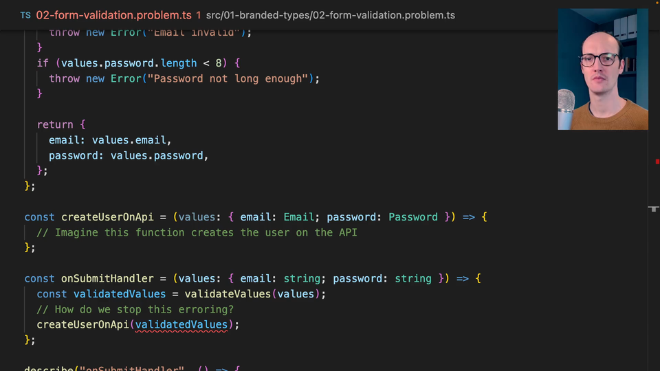 0:00 In this exercise, we're going to look at brands as a way of understanding the logic and making sure that the logic is totally safe in your application code. We have a few functions here. We have onSubmit handler, create a User on API, and validate values.