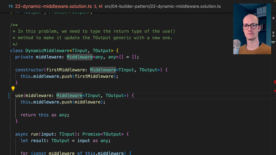 0:24 Currently, use is not generic, which is bonkers because whatever we return from the middleware that we pass to use, that's got to be the new generic inside DynamicMiddleware, because currently, inside use, this looks right but it's totally wrong because the first thing that we infer there, it then needs to be exactly the same function type throughout the rest of it, so inside here and inside here, which means that we don't get back the user on our fetchUser, and req.userId doesn't exist on type request yet.