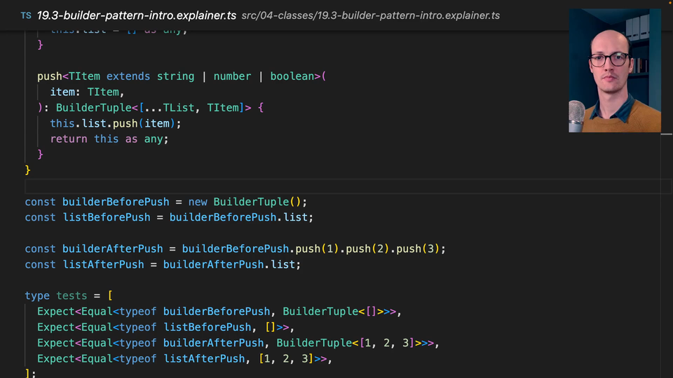 0:40 You've got builderBeforePush and then builderAfterPush. It's literally just pushing it onto the type level there. Push number 2, and we get builder 1, 2, and then push 3, and then we end up with BuilderTuple 1, 2, 3. The list after the push is 1, 2, and 3. That's what these tests are looking at here.