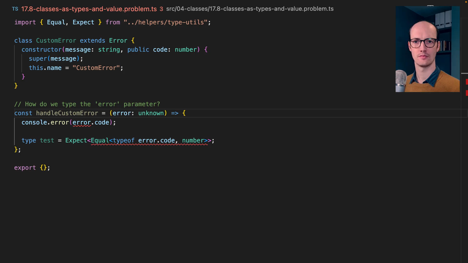 0:43 It's a cool pattern that we've not really explored before in total TypeScript. The thing I'm interested in is how do we type this error parameter? We want to know that the error has a code on it, and we also probably want to know that the error has a message on it. We want to make sure the thing we're passing in is a CustomError. Good luck.
