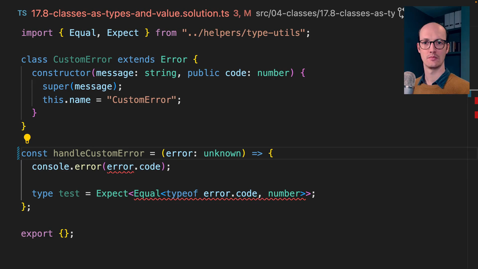 0:00 The solution here is actually beautifully simple. We can specify error as, I mean, we could specify as, let's say code number like this and maybe have a message on it string. If we pass something to it, so constCustomError is new CustomError. Let's set this up again, oh no, 401.
