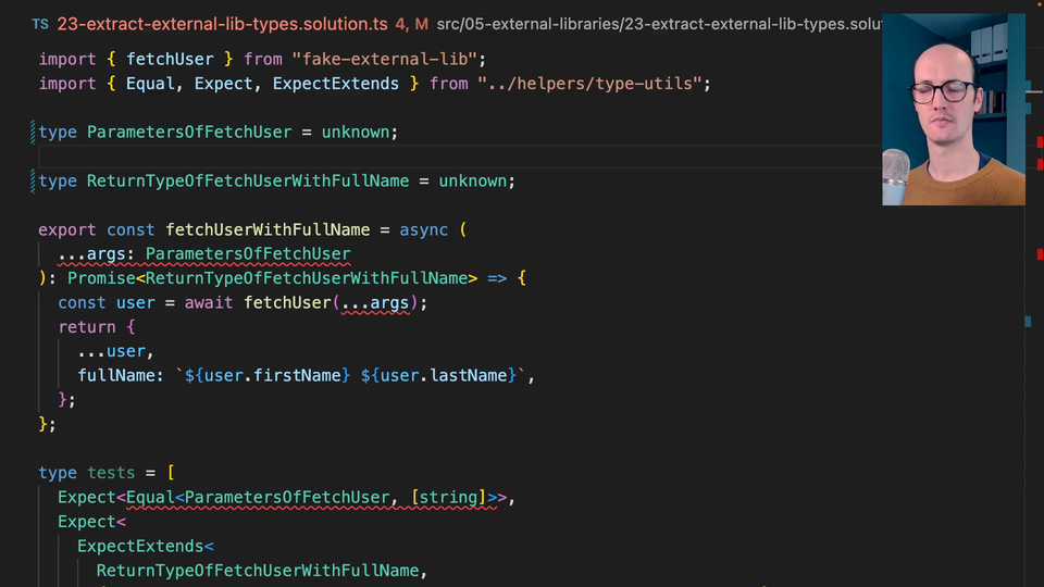 0:01 The solution here is to...First of all, let's do the easy bits. We know how to get the parameters of fetch user. We use parameters. We pass in type of fetch user. What we have here is we end up with ID string, which is really good because then this test passes. It means that when we call fetch user with full name, then we have to pass in ID string.