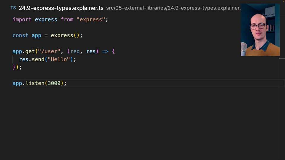 0:00 In the exercise after this, we're going to be diving into the types for express. Express is a library that lets you build a REST API really simply. What you can do is you can import express from express. Express is one of these libraries that has types, which come from Definitely Typed. 0:19 Definitely Typed is a repository that contains type definitions for lots and lots of libraries, which aren't built in TypeScript. Express itself isn't built in TypeScript. If we look at the type definitions there, we'll see that, you can see there in node_modules/@types/express and then index.d.ts.