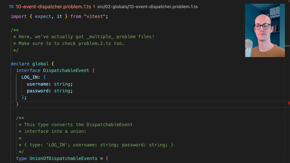 1:39 I want to say, "I have my handler co-located with the events that I expect. Can I do it from within this file?" You can. You'll need a declare global. You'll need to understand all of the stuff about ambient context and declaration merging that we've learned already. You should be able to figure it out from there. Good luck.