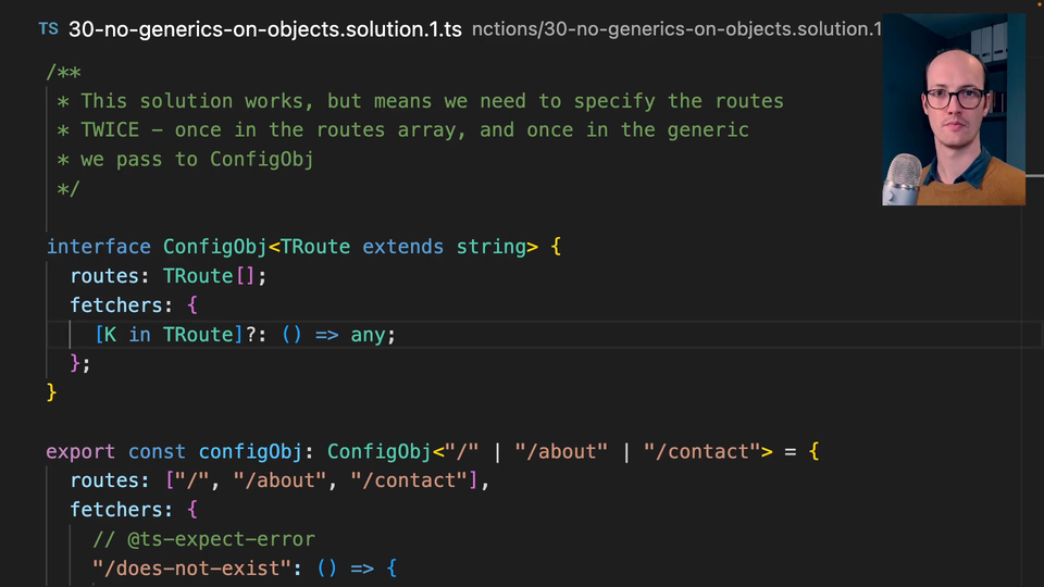1:02 Let's take a look at the real solution. The real solution is to have TRoute extends string. Then this makeConfigObj, config ConfigObj TRoute, returns config. It's just an identity function. Now we're using exactly the same definition as we had in the previous exercise or the previous solution. This one is just the same as this one.