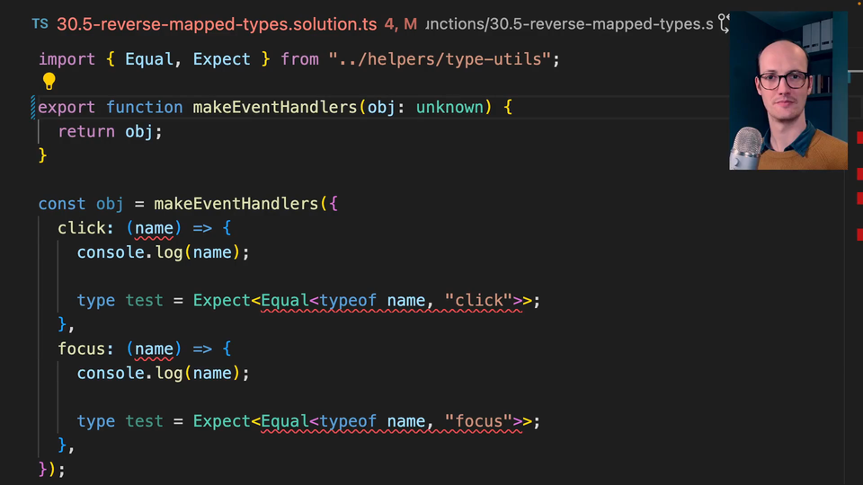 0:00 Ready? makeEventHandlers. What we can do here is we need a generic. Let's call it TObj, for instance. This TObj, let's imagine that we just pass it in like this. What we're going to get here is we're going to get click name any void, focus name any void.