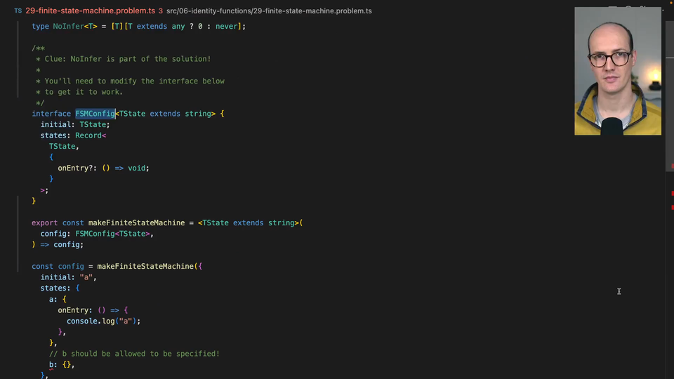 00:00 In this exercise, we have an interesting problem. We have a makeFiniteStateMachine function. This makeFiniteStateMachine takes in a config of fsmConfig, and one of the type parameters, or the only type parameter we're using is tstate. Now, tstate can be inferred in one of two places. It can be inferred in this initial slot,