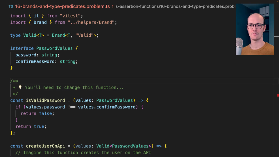 0:00 In this exercise, we're going to combine the type predicates that we've seen before and the brands that we've seen before as well. We have a similar setup to an exercise we've done before, which is we have isValidPassword, createUserOnApi.