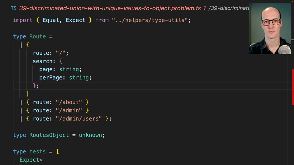 0:27 What you'll see is that, when you try to create a RoutesObject, which is basically going to be a keyed object of this, then you're going to see that it's harder to extract the search from the place that you think it's going to be. You're going to need a bit of infer here.