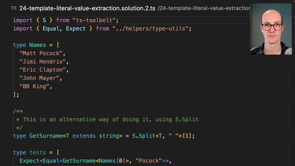 0:28 The solution I wanted you to find was this one, which is GetSurname here, we can say, "T extends." Then we open up a template literal. Inside this template literal, we can add these infers. We can say, "infer First" and then space and then "infer Last" and then just return the last name.