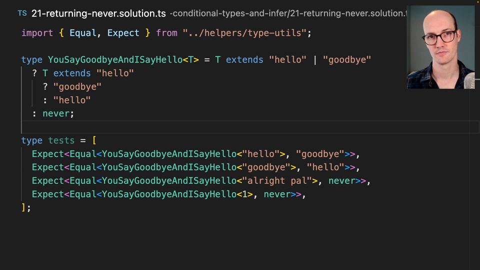 1:49 Never is a way of signaling to your types that something should never happen. We're going to break this down in a separate part of the module, and you may indeed have seen it already. This pattern though of returning never allows your conditional types to specify their else logic without having to worry too much about what it is.