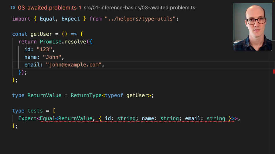 0:19 We don't return type, but what we're getting back is a promise. Your job is to try and see if we can extract the awaited result of that Promise. This is going to need another utility type as one. What we want is for return value to be equal to ID string, name string, and email string.