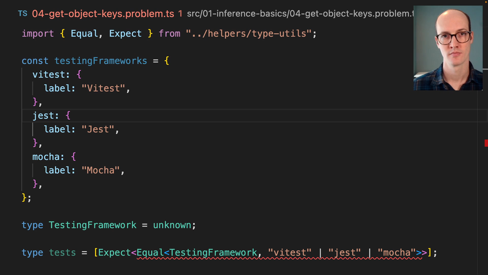 0:00 In this exercise, we have a bunch of testing frameworks here. We want to extract a union type of each of these keys. We want to get Vitest, Jest, and Mocker into a union. What that's going to look like is we could do this with Vitest or Jest, or Mocker here.