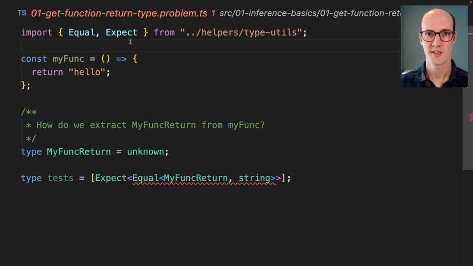 0:09 What we want to do is somehow take that knowledge of what this function returns and stick it inside MyFuncReturn. We need to change this unknown to somehow be a string. Of course, we could just type this out, but then if this changes then it's not going to be the same anymore.