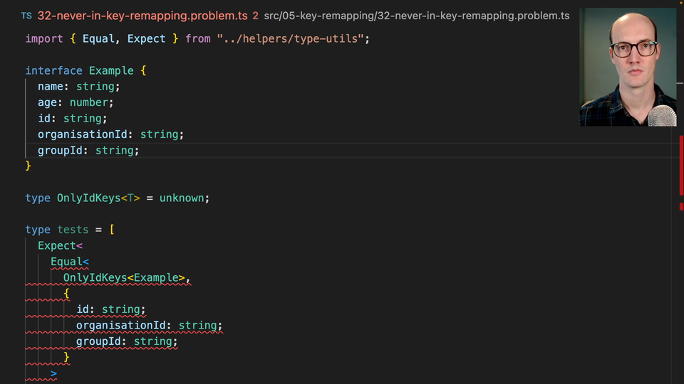 0:00 In this exercise, we have an example object here with a bunch of keys in. Several of them have keys which contain IDs. We want to create a new object out of that using this type helper OnlyIdKeys to extract only the keys that contain an ID.